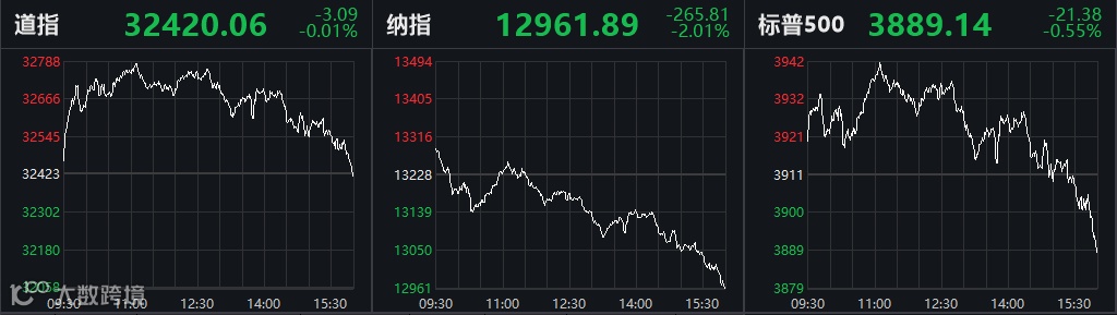 隔夜,道指由涨转跌0.01%,报32420.06点;标普500跌0.55%,收创2周新低,报3889.14点;纳指跌2.01%,报12961.89点。