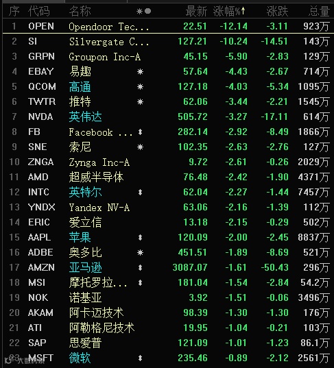 大型科技股普遍下跌,英伟达跌逾3%,FACEBOOK跌近3%,美光科技、奈飞公司、赛富时跌逾2%,苹果公司跌近2%,亚马逊跌逾1%。