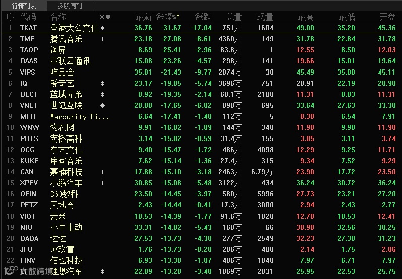 热门中概股集体重挫,香港大公文交所跌逾32%,腾讯音乐跌逾27%,唯品会跌逾21%,爱奇艺跌逾19%,贝壳跌逾13%,哔哩哔哩跌逾9%。新能源汽车股普跌,小鹏汽车跌逾15%,理想汽车跌逾13%,蔚来跌逾10%。