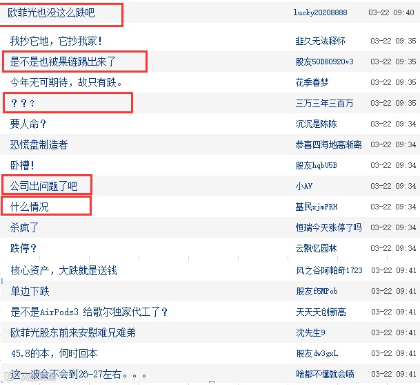 还有网友表示,欧菲光也没这么跌吧,是不是也被果链踢出来了?不过,也有网友表示,暴跌不意外,股价翻了3-4倍,回归正常值很正常。另有投资者称,“核心资产,大跌就是送钱。”