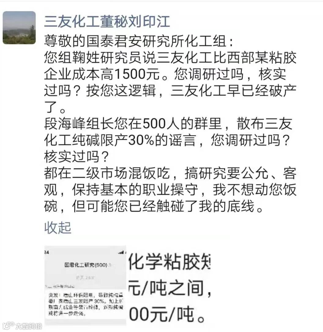 在刘印江朋友圈中,他对国泰君安研究所化工组直言:“都是在二级市场混饭吃,搞研究要公允、客观,保持基本职业操守。我不想动您的饭碗,但可能您已经触碰了我的底线。”这一言论不可谓不狠。