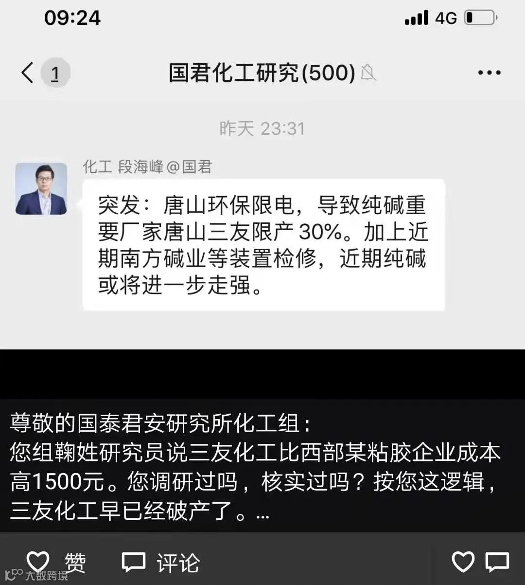 原来,昨日夜间,段海峰在“国君化工研究”的500人微信群中发布了一则消息,消息原文显示为是一则突发新闻。“突发:唐山环保限电,导致纯碱重要厂家唐山三友限产30%。加上近期南方碱业等装置检修,近期纯碱或将进一步走强。”
