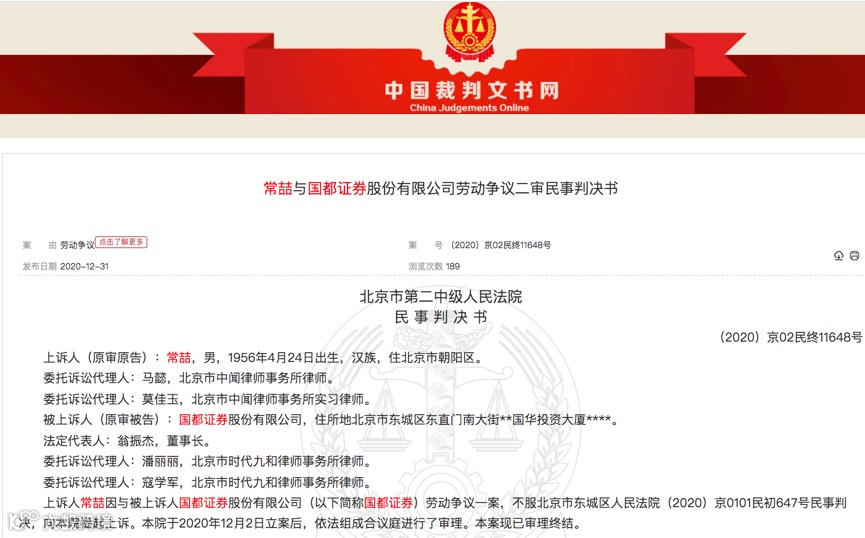 裁判文书显示,常喆于2001年12月28日入职国都证券,17年后办理退休手续,退休时间为2018年11月30日,曾任国都证券总经理。