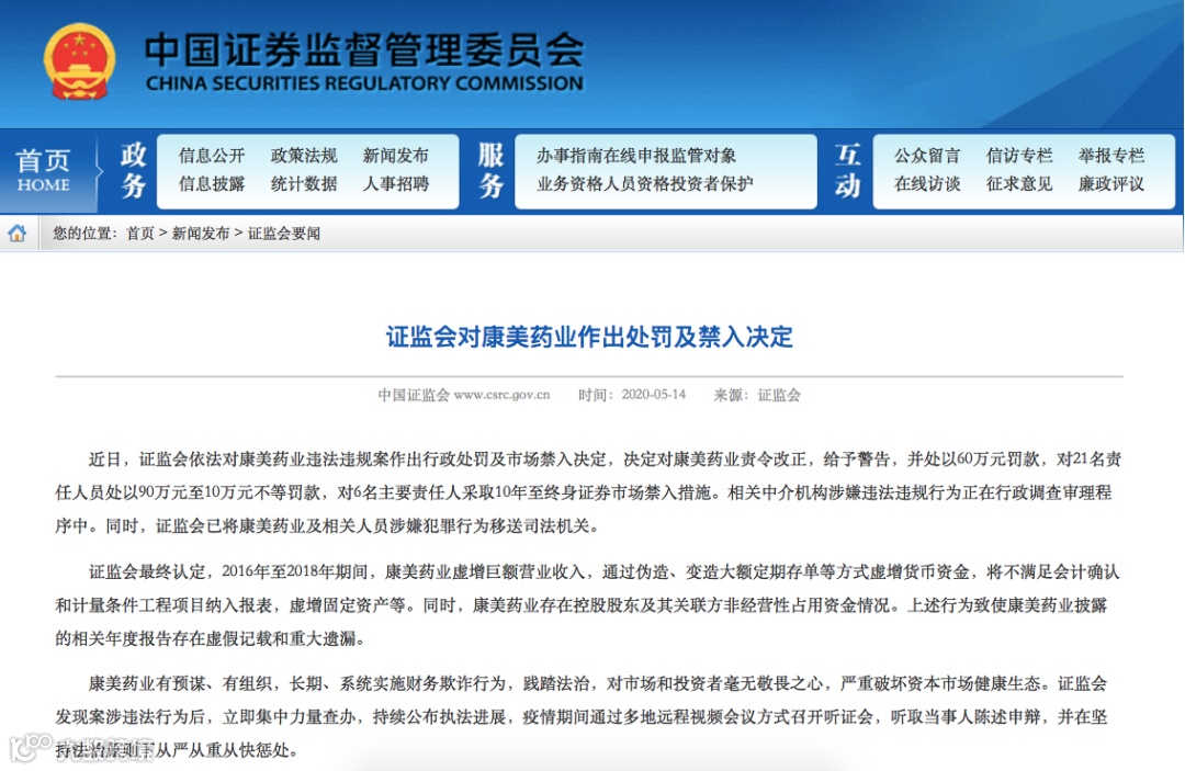 2020年5月14日,证监会相关负责人表示,近日,证监会依法对康美药业违法违规案作出行政处罚及市场禁入决定,决定对康美药业责令改正,给予警告,并处以60万元罚款,对21名责任人员处以90万元至10万元不等罚款,对6名主要责任人采取10年至终身证券市场禁入措施。