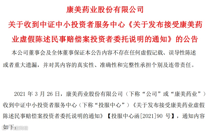 3月26日,投资者起诉康美药业虚假陈诉责任纠纷案件取得新进展,投服中心也正式接受投资者委托替投资者打官司。