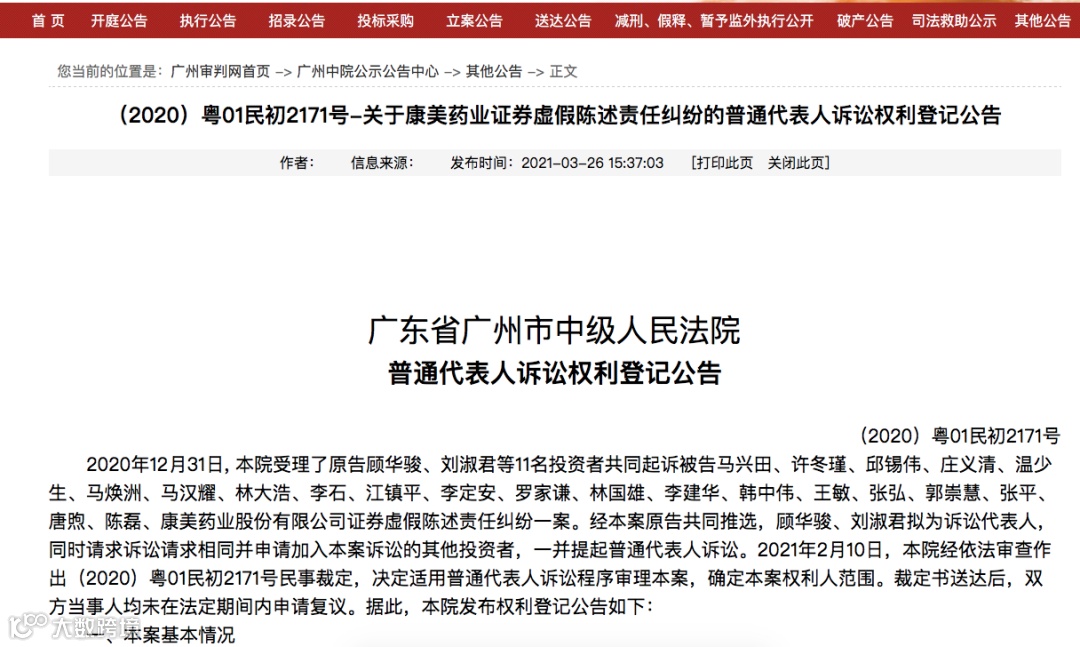 3月26日,广州中院发布普通代表人诉讼权利登记公告,明确权利人范围及登记期间,即:自2017年4月20日(含)起至2018年10月15日(含)期间以公开竞价方式买入、并于2018年10月15日闭市后仍持有康美药业股票,且与本案具有相同诉讼请求的投资者,可以于2021年4月25日之前登记加入该案诉讼。