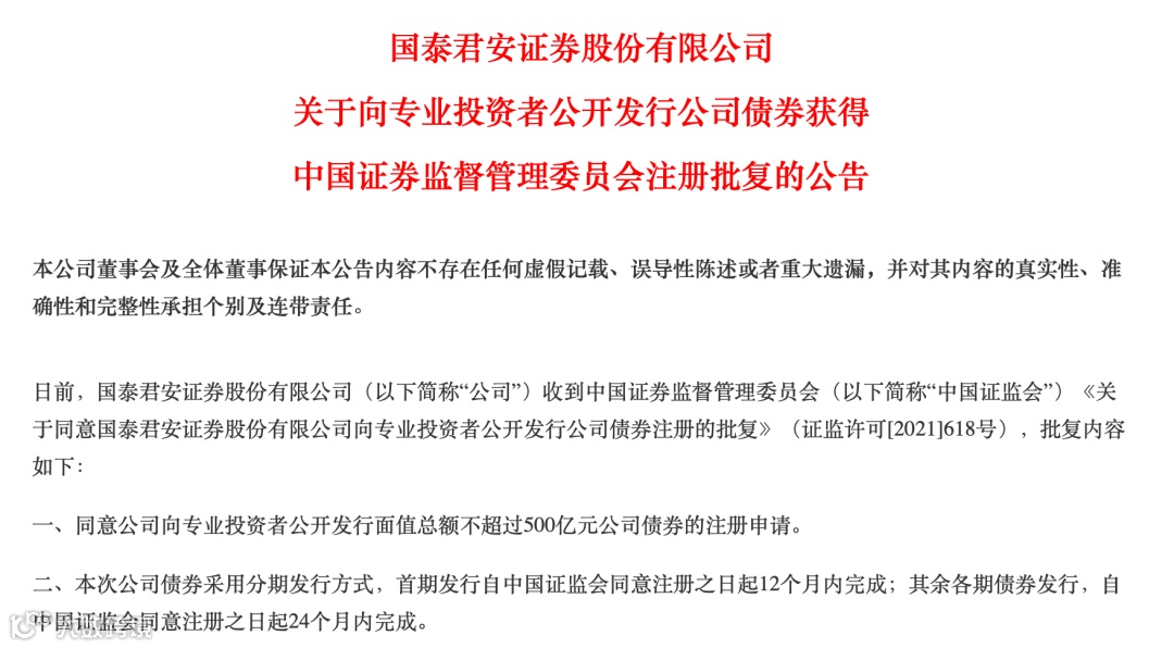 3月9日晚间,国泰君安公告,收到证监会批复,同意公司向专业投资者公开发行面值总额不超过500亿元公司债券的注册申请。