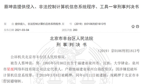 日前,这起案件有了新进展:中国裁判文书网公布了北京市丰台区人民法院对“星援”APP开发者蔡坤苗的判决书,其因提供侵入计算机信息系统程序罪一审获刑五年,并处罚金10万元。