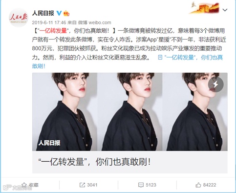 2019年,在公安部组织开展的“净网2019”专项行动中,北京警方将涉嫌参与此事的制造假流量的犯罪团伙抓获。据《半月谈》当时的报道,该犯罪团伙开发了一款名为“星援”的App,可用于在短时间内刷高评论量、转发量、点赞量,不到一年时间非法获利获利近800万元。