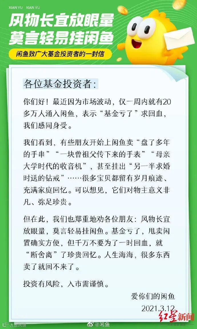 3月12日下午,闲鱼官方微博发布致广大基金投资者的一封信,信中称,最近因为市场波动,一周内就有20万人涌入闲鱼,表示“基金亏了”求回血。