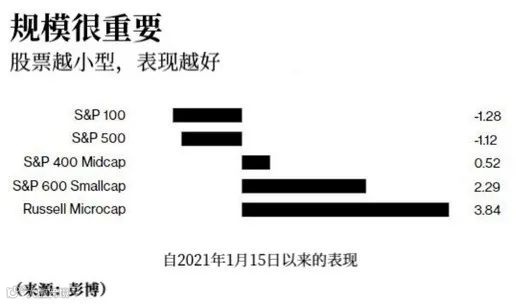 同时,据彭博的统计数据显示,自2021年1月15日以来,低价股的交易量也迅速激增,股票市值越小,涨势越明显。