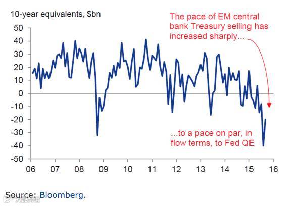 自人民币经历了811汇改之后,其他新兴市场国家也开始进入了贬值模式。随着市场对人民币贬值预期的加大,人民币持续承压,这迫使中国央行干预大陆外汇市场,甚至离岸现汇市场。这意味着消耗大量外汇储备,新兴市场国家开始进入了一场美元储备消耗盛会。根据高盛的预测,2015年各国央行每月大概抛售340亿美元的外储。有分析师提出,这将迫使美国国债价格降低收益率上升。美国与其他国家债券市场利率差的扩大将使美国资产更具吸引力,加快资金回流到美国市场,这会直接改变货币需求,造成美元上涨。