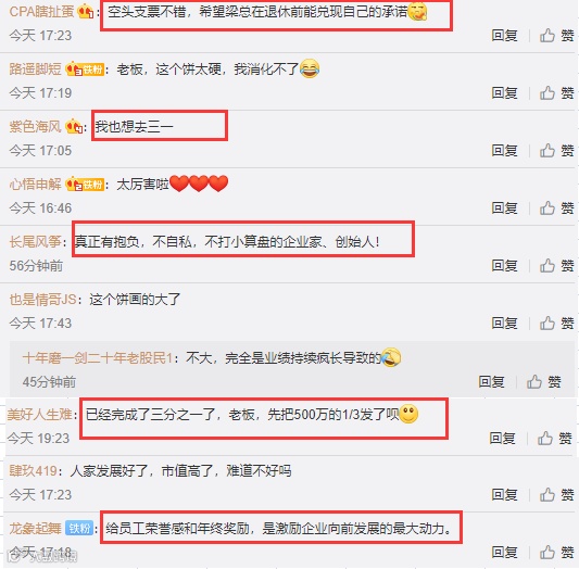 对于三一集团重奖员工的行为,不少网友表示羡慕。有网友称,“我也想去三一”、“给员工荣誉感和年终奖励,是激励企业向前发展的最大动力。”还有网友戏称:“已经完成了三分之一了,老板,先把500万的1/3发了呗”。也有网友调侃:“老板,这个饼太硬,我消化不了。”
