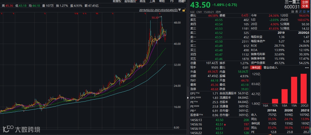 比业绩更人惹眼的,是三一重工的股价表现。统计数据显示,2019年公司股价上涨118%,2020年再度大涨109%,2021年以来再度上涨24%,大幅跑赢行业平均涨幅及三大指数。