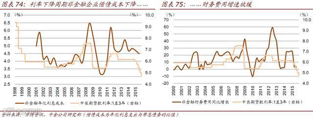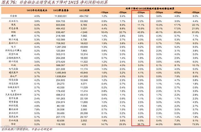对利率较为敏感的高杠杆行业有望受益利率下行周期。历史数据表明,利率下降周期中非金融企业借贷成本随着基准利率下降而降低,财务费用增速也有所放缓。我们的测算表明,非金融企业年化借贷成本下降 25个基点,减少的利息支出将占 1H15利润的3%,而对有色、煤炭等高杠杆行业而言影响更为显著。