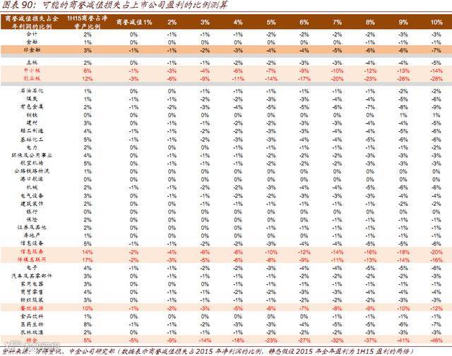 关注收购兼并带来的商誉及未来对业绩可能造成的影响。静态来看,若目前非金融企业账面商誉减值 5%,减值损失预计占非金融上市公司 2015 年利润的 4%(占创业板 2015 年利润的 14%)。信息服务、传媒互联网、综合等行业商誉减值对利润的影响较大。我们在后文的图表中列示了商誉占净资产比例较大的公司,以供参考。