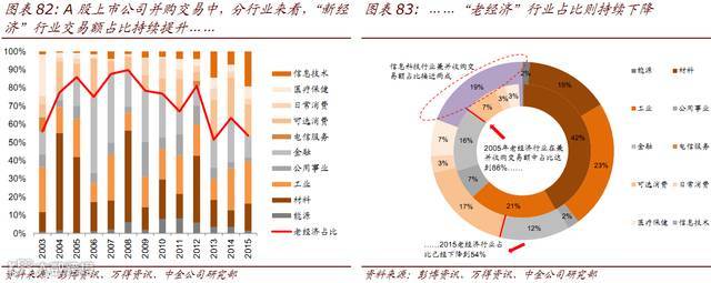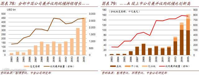 近年来中国企业收购兼并持续增长,交易额连年上升。从结构来看,收购兼并的趋势与中国经济转型的大背景相契合:“新经济”行业(特别是可选消费、信息技术行业)占比提升较快,而“老经济”行业占比则持续下降。年初至今,中小板及创业板交易总额超过 600 亿美元,是上市公司并购交易额创新高的主要动力。