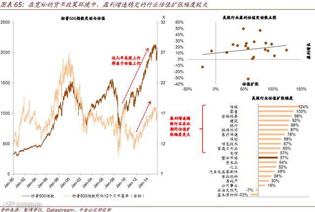 4.行业层面上看,,增长预期稳定且相对快(传媒、信息科技、医药、休闲娱乐等) 、低利率的环境中需求有改善的行业(房地产及相关建筑、保险等)两类行业估值扩张将高于市场。