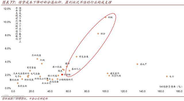 利率下降将节省财务费用,也可能刺激总需求。目前 A股非金融类上市公司财务费用占收入的比例是 1.5%,利息支出占收入的比重是 2.2%,与银行的平均贷款资金成本密切相关。每 25 个基点的降息,将使得利息支出降低 5.6%(占利润的比例约 3%)。行业层面看,高负债行业对降息的敏感度更高。