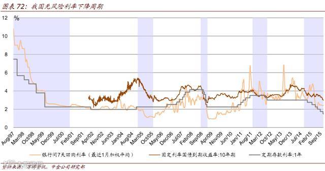 1998年以来,我国总共经历过五次较为明显、持续时间较长的无风险利率(以国债收益率或银行间回购利率衡量)下行阶段。除第二次(2004 年底至 2005 年底,在 2004 年底加息后国债收益率下行)外,其余四次(分别开始于2008年 8月、2011年 8月、2014年 9月)均与降息周期叠加。