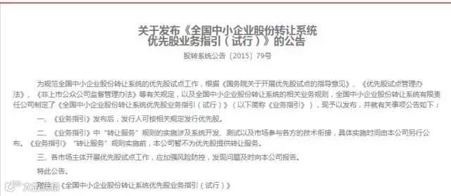 2015年9月22日,股转系统发布优先股业务指南,为挂牌企业提供了另外一个融资渠道,同时明确在2015年11月底之前做好优先股转让技术准备。