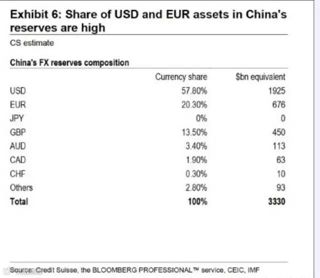 这是最近瑞信研报里透露的一张如表,标题为"在中国的外汇储备里,美元和欧元资产占比最高”。