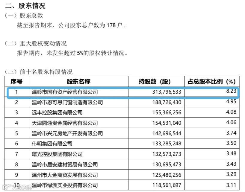 在中国外汇交易中心官网上,民泰银行在2020年披露的一份年报显示,其股权架构较为分散。具体来看,截至2019年末,该行第一大股东(持股8.23%)为浙江温岭市国有资产经营有限公司、持股比例3.138亿股;持股比例居第二位的为温岭市恩可思门窗制造有限公司,持有1.887亿股、持股占比4.95%;而该行第十大股东持有1.1856亿股、持股占比3.11%。