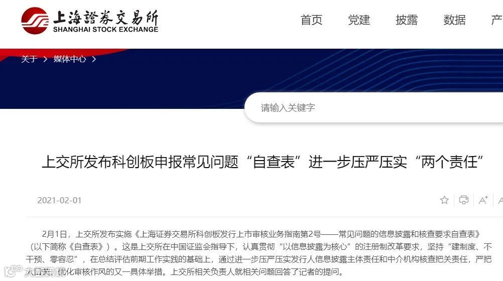 2月1日,上交所发布实施《上海证券交易所科创板发行上市审核业务指南第2号——常见问题的信息披露和核查要求自查表》(以下简称《自查表》)。上交所表示,这是该所在中国证监会指导下,认真贯彻“以信息披露为核心”的注册制改革要求,坚持“建制度、不干预、零容忍”,在总结评估前期工作实践的基础上,通过进一步压严压实发行人信息披露主体责任和中介机构核查把关责任,严把入口关、优化审核作风的又一具体举措。