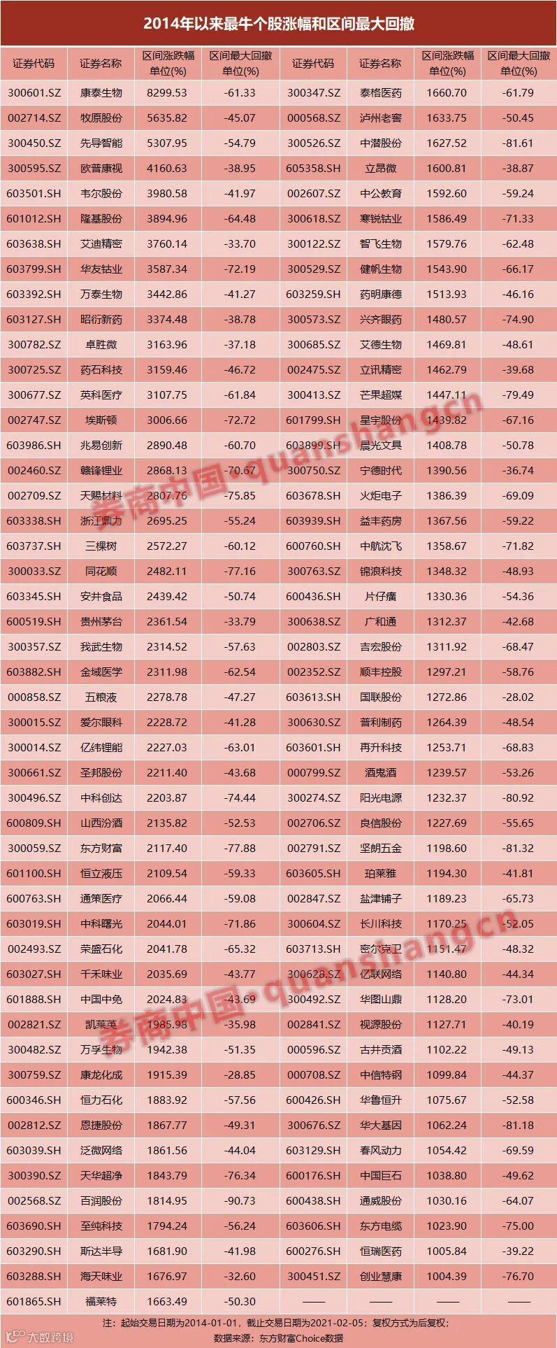 如果仅有收获十倍股的雄心,却没有承受回撤超过30%的勇气,投资人是难以骑住牛股的。券商中国记者复盘了2014年1月1日至2021年2月5日最牛的个股群体,发现共有98只个股涨幅超过10倍,但这群个股上涨的途中无一不经历过巨幅回撤。