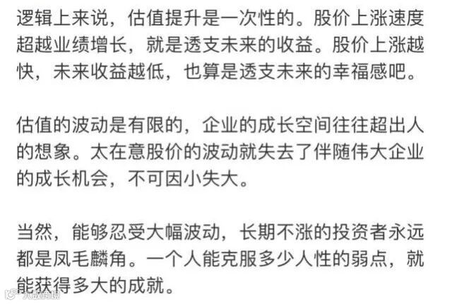 对于顶尖投资人来说,拿住牛股,就要在估值上不能犯精确的错误,10倍估值并不代表低,50倍估值也并不代表高,估值一定与生意模式相匹配。