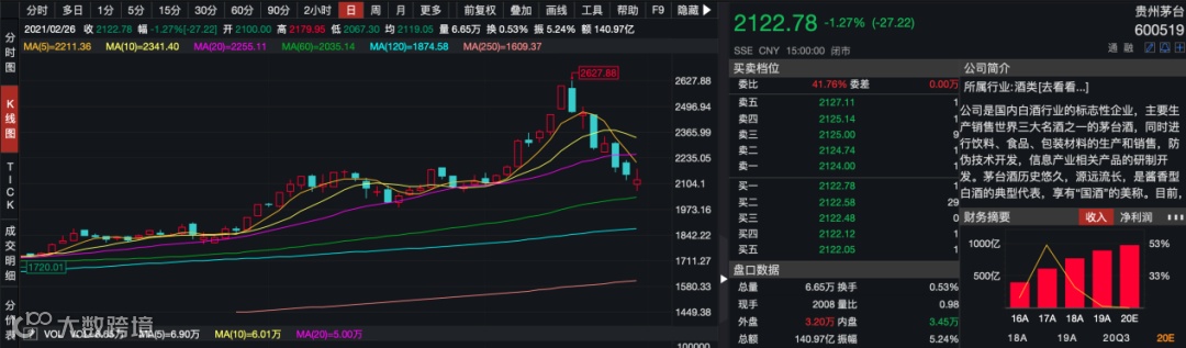 在A股市场,贵州茅台从2627.88的高点,跌到了2122.78元每股。