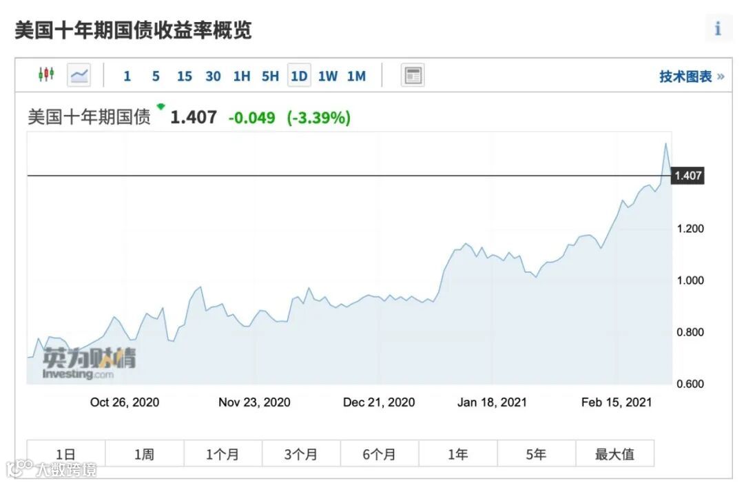 事实上,“再通胀交易”已经让一些投资者苦不堪言。受到美国经济复苏和再通胀预期加强,美债收益率近期直线上升,10年期美债收益率一度飙升到1.6%之上。