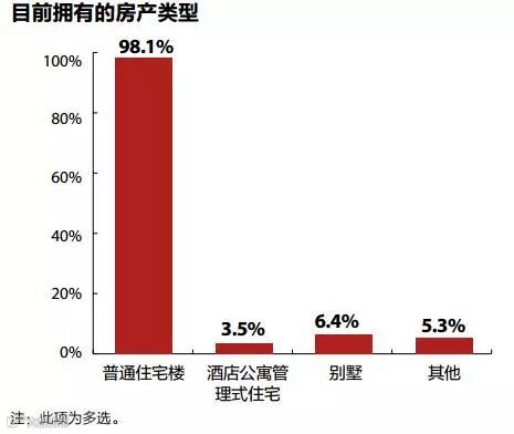 在调查的大众富裕阶层中,有95.1%表示拥有自己的住房。在房产类型上,98.1% 的人拥有普通住宅楼,只有6.4%的人拥有别墅,3.5%的人拥有酒店公寓管理式住宅。可见,大众富裕阶层更青睐购买普通住宅楼,因为独具投资慧眼的他们认为,从投资房地产的角度来看,普通住宅楼也相对最容易变现。
