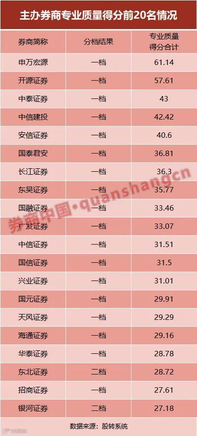 根据近期全国股转系统披露的2020年度主办券商执业质量评价结果,第一档共有20家。