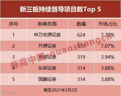 数据显示,截至2021年2月2日,申万宏源辅导的已经申报精选层或开始精选层挂牌辅导的企业数量为21家,业内第一。而开源证券排名第二,共有12家。
