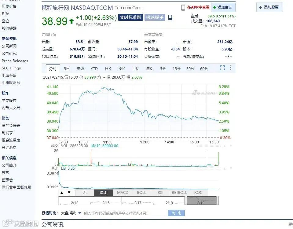 携程网股价也稳步抬升,自2020年下半年以来累计涨超50%,最新股价为38.99美元/股,总市值231亿美元,恢复到疫情前的水平。尤其2月份以来,携程网连续大涨,累计涨幅达22%。截至目前,公司市值达231亿美元。