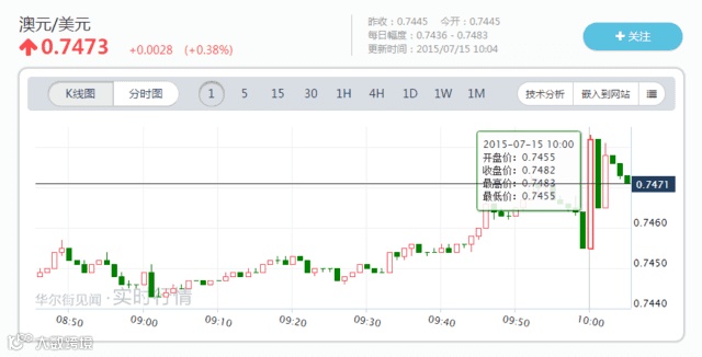 数据发布后, 澳元/美元快速走高,但涨幅随即有所回落。
