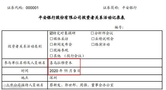 与此同时,平安银行还在深交所互动易平台披露了调研活动信息,显示公司于2020年11月9日在深圳接受了喜马拉雅资本的调研,接待调研参与人员包括行长特助蔡新发、副行长郭世邦、董秘周强等。