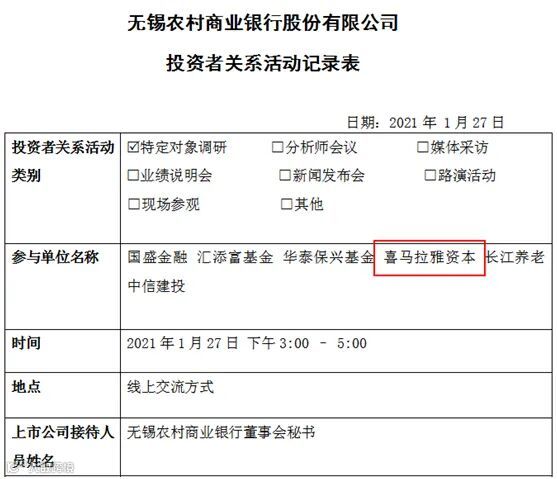 1月28日无锡银行(600908)发布的投资者调研报告显示,1月27日,国盛金融、汇添富基金、华泰保兴基金、喜马拉雅资本、长江养老、中信建投等机构参与了调研,而其中最引人注目的,则是喜马拉雅资本。接待人员是董秘,交流方式为线上。