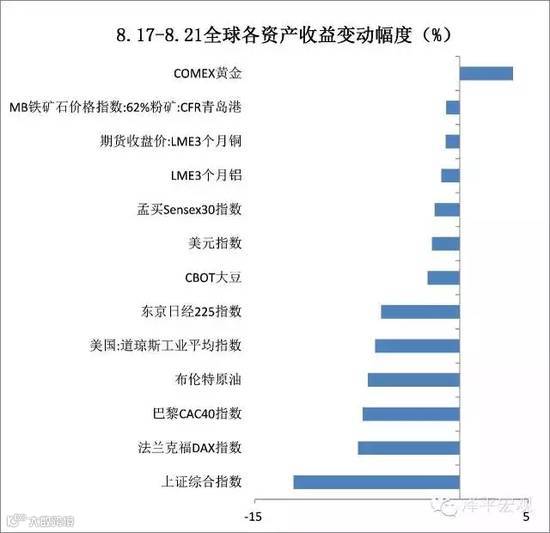 全球股市调整,债市和贵金属反弹。8月21日,道琼斯工业平均指数跌幅3.12%,纳指收跌3.53%,欧洲泛欧绩优300指数收跌3.40%,上证综指下跌4.2%,周累计下跌11.5%。港股周跌6.59%,创2011年9月份以来低位。台湾股市指数从4月高位以来也暴跌超过22%。韩国综合指数周跌5.41%,日经225指数周跌幅5.28%,创下16个月来最差,印尼股市周跌5.42%。美国10年期国债周累计下跌14个基点。