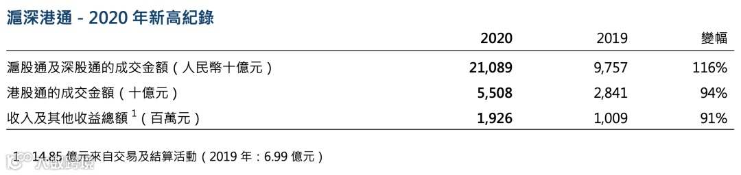 2020年是沪港通开通六周年及深港通开通四周年。根据香港交易所披露的数据,2020年沪深港通成交额及平均每日成交额均创新高,其中北向交易及南向交易的成交金额分别达人民币21.09万亿元及5.51万亿港元;平均每日成交金额分别达人民币913亿元及244亿港元。