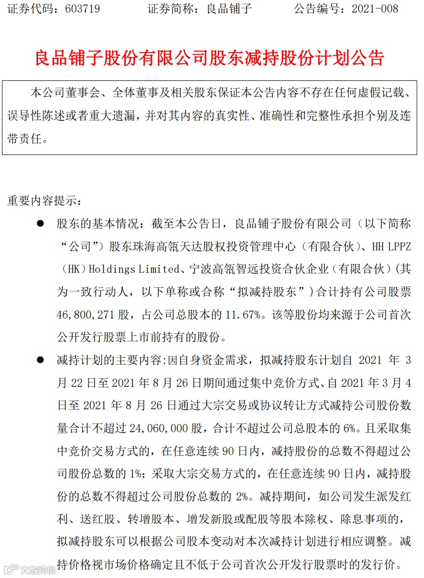 2月26日晚间,良品铺子发布公告称,高瓴资本旗下合计持股11.67%的三大股东,拟减持不超过2406万股公司股份,占总股本的6%。
