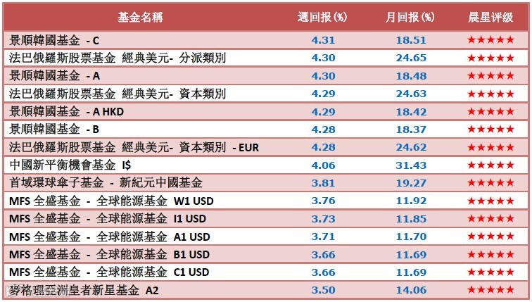 【一周星级环球基金收益(前十五名)】