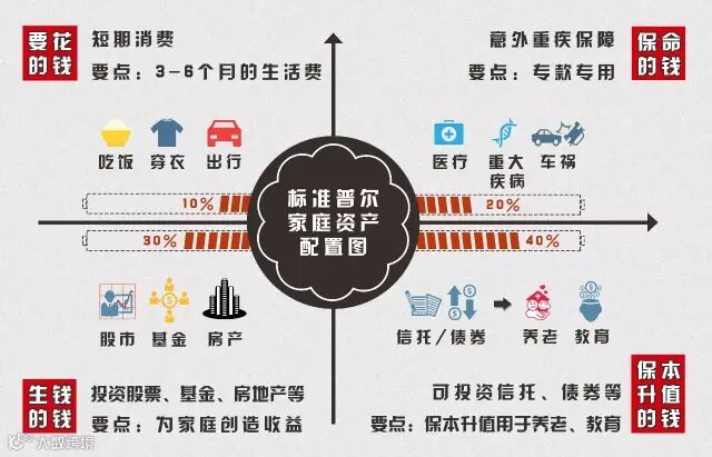 “标准普尔家庭资产象限图”把家庭资产分成四个账户,这四个账户作用不同,所以资金的投资渠道也各不相同。只有同时拥有这四个账户,并且按照相对固定合理的比例进行分配才能保证家庭资产长期、持续、稳健的增长。