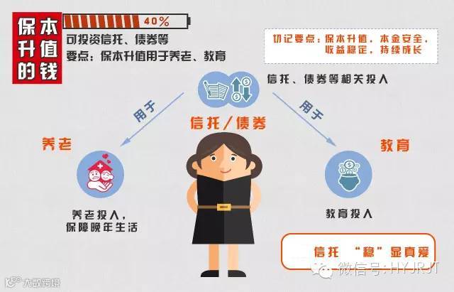 第四个账户是长期收益账户,也就是保本升值的钱。一般占家庭资产的40%,主要是保障家庭成员的养老金、子女教育金、留给子女的钱等。这个账户的钱要抵御通货膨胀的侵蚀,因而与投资收益账户的作用不同,其本金要较为安全,收益不一定高但长期较为稳定。这部分账户资产可以投入到信托、债券市场。