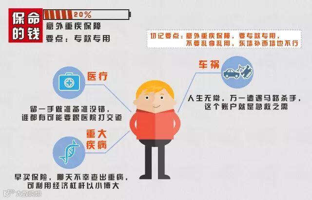 第二个账户是杠杆账户,也就是保命的钱,一般占家庭资产的20%,为的是以小博大。这个账户保障突发的大额开销,一定要专款专用,保障在家庭成员出现意外事故、重大疾病时,有足够的钱来保命。