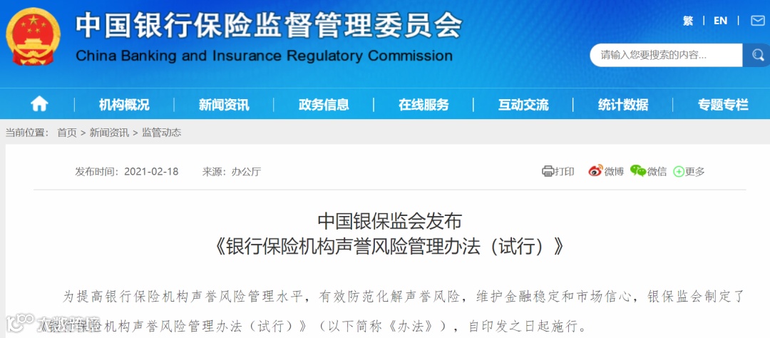 如何维护好这块金字招牌?牛年开工第一天,银保监会发布《银行保险机构声誉风险管理办法(试行)》,新规自印发之日执行。