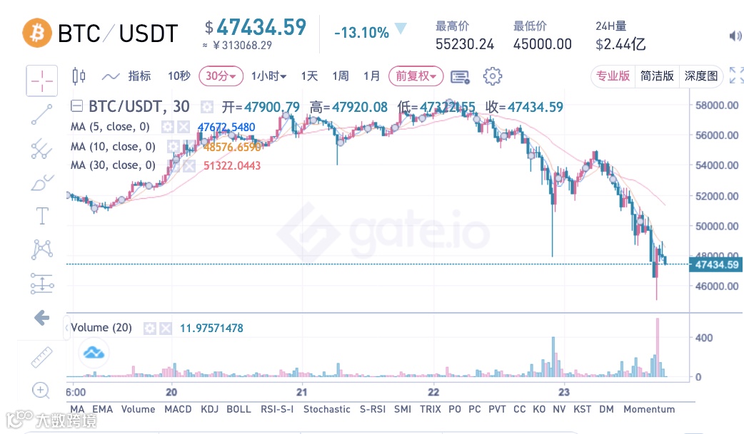 23日下午,比特币价格向下击穿45000美元,日内连破50000美元、49000美元、48000美元、47000美元、46000美元,45000美元六大关口,24小时内跌超17%,截至发稿,价格在48000美元左右徘徊,跌幅有扩大趋势。