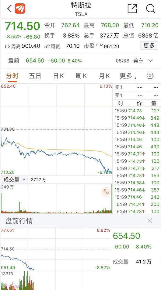 值得注意的是,近期马斯克对于数字货币的公开唱多,令市场情绪持续高涨,特拉斯也真金白银做多,投资比特币15亿美元、约合人民币96.74亿元,并表示将很快接受比特币作为购买汽车和其他产品的支付方式。如今或许受比特币暴跌影响,特斯拉盘前跌幅扩大至近9%,昨日收跌超8%。