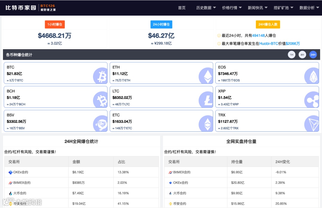 另据比特币家园数据显示,24小时内,数字货币合约共爆仓299亿人民币,涉及币民49万多人。
